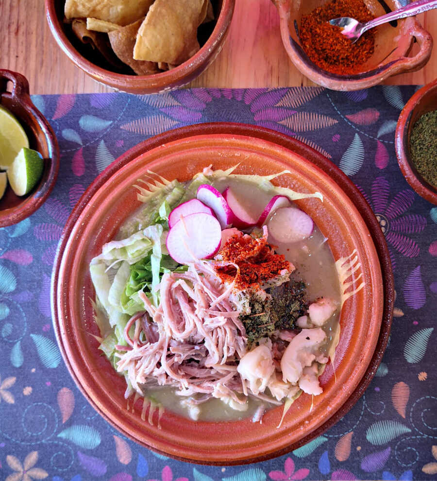 Pozole de maíz cacahuazintle cocinado lentamente en caldo verde de pipián de cerdo o pollo.