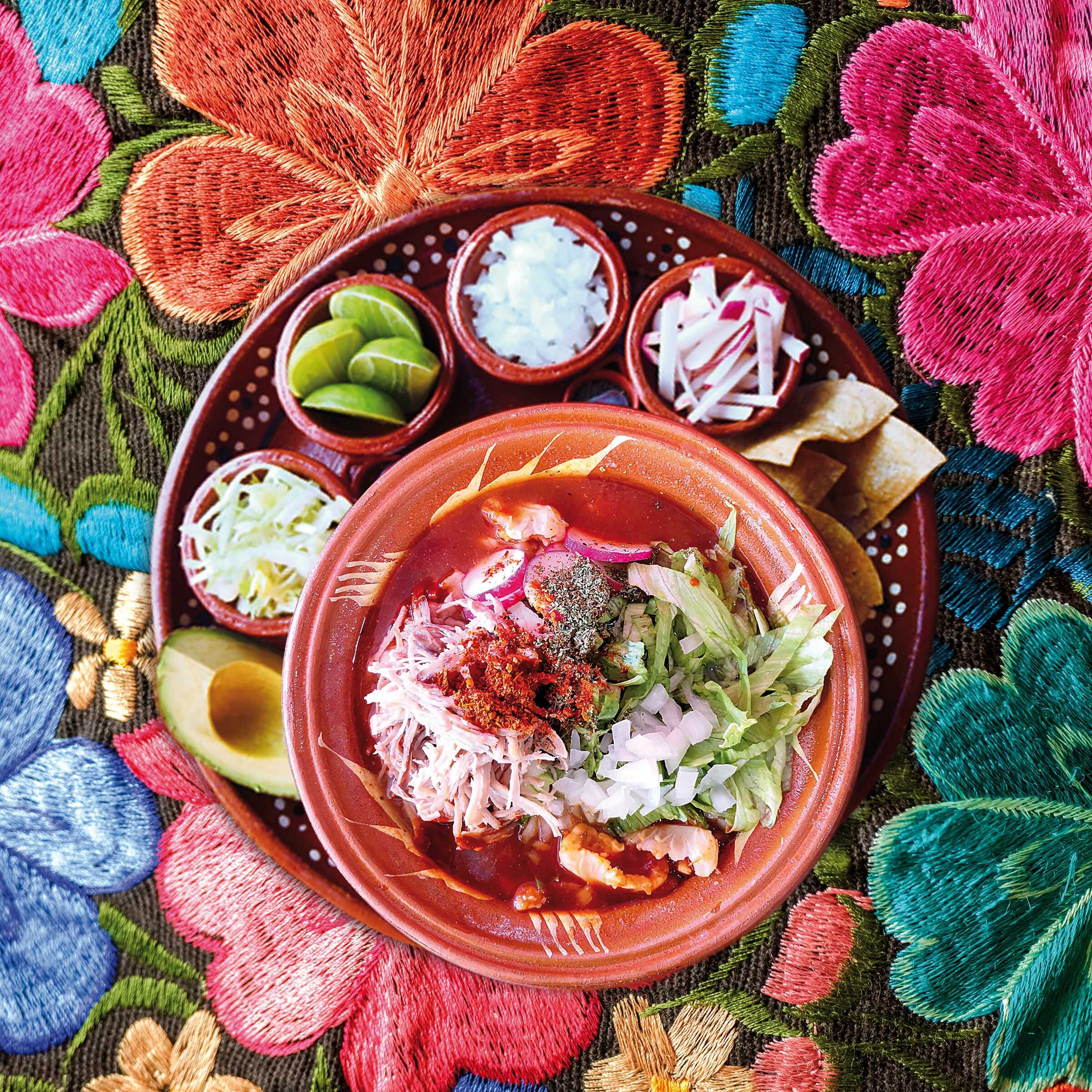 Pozole de maíz cacahuazintle cocinado lentamente en caldo rojo de chiles secos de cerdo o pollo.