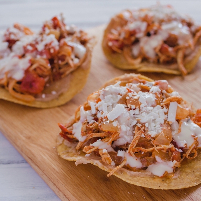 Tres tostadas de maíz con frijoles, lechuga, guisado a elegir, crema y queso. Todo se manda separado.