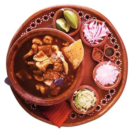 Pozole de maíz cacahuazintle cocinado lentamente en caldo rojo de chiles secos, con menudo de res.