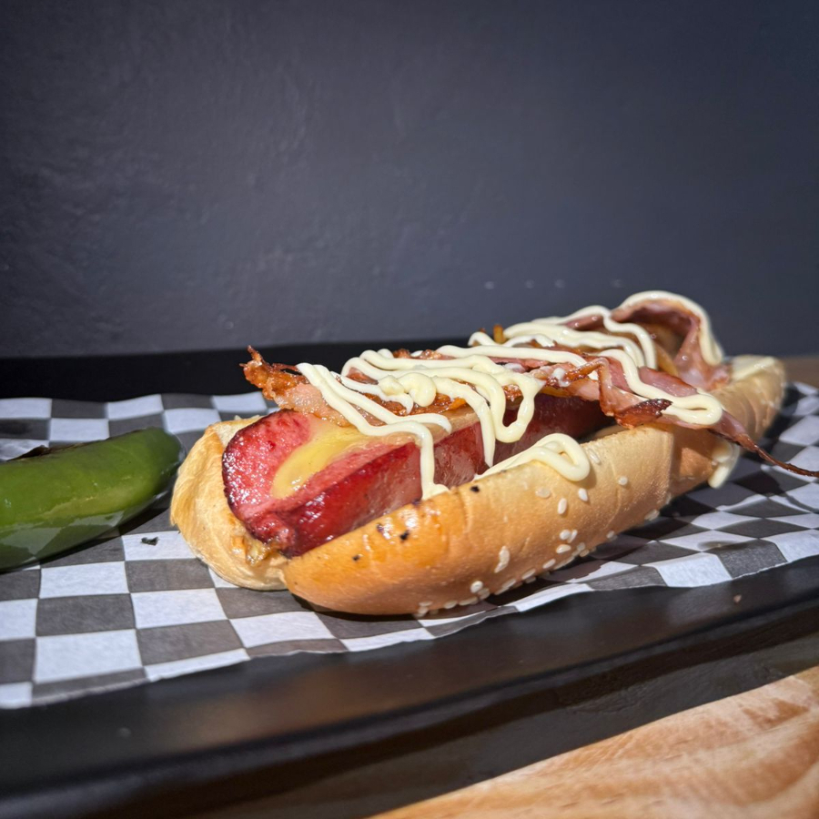 SALCHICHA JUMBO, TOCINO, QUESO, PICO DE GALLO + CHILE TOREADO + CEBOLLA CARAMELIZADA