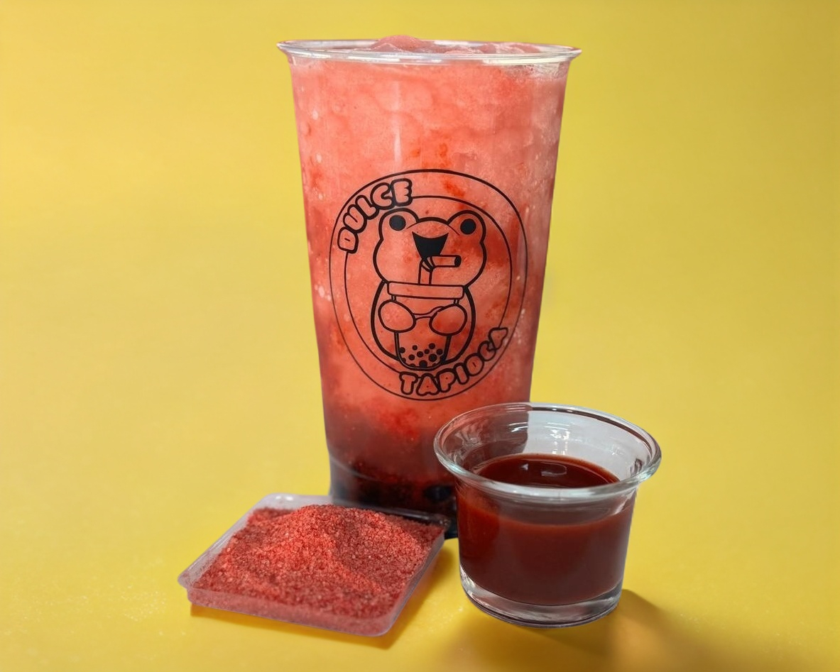 Delicioso frappe base agua con fruta natural, con perlas de tapioca, 22 oz.