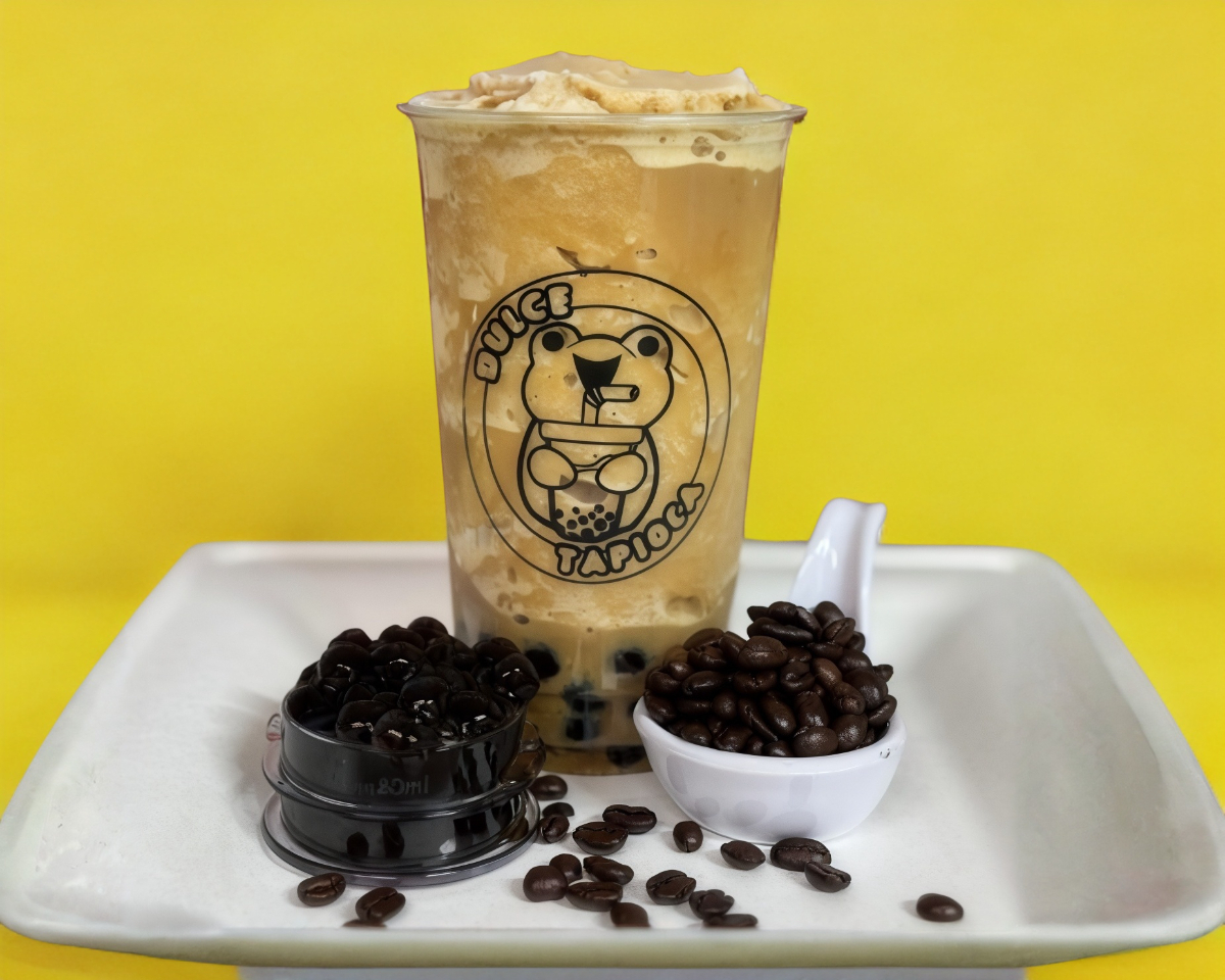 Deliciosa bebida liquida fría, base leche con shot de café y perlas de tapioca 22 oz