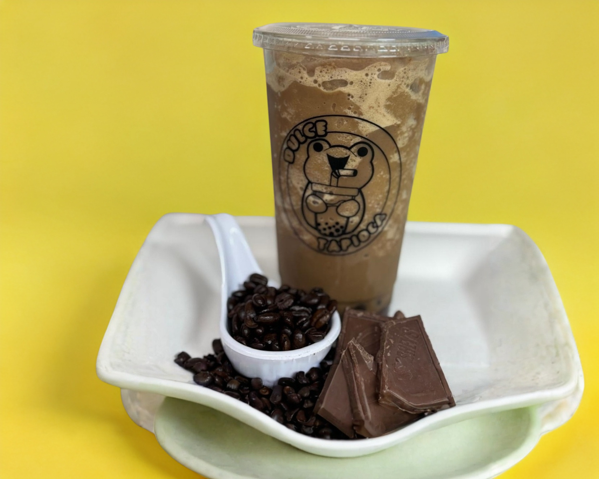 Delicioso frappe base leche sabor chocolate con café, con perlas de tapioca, 22 oz