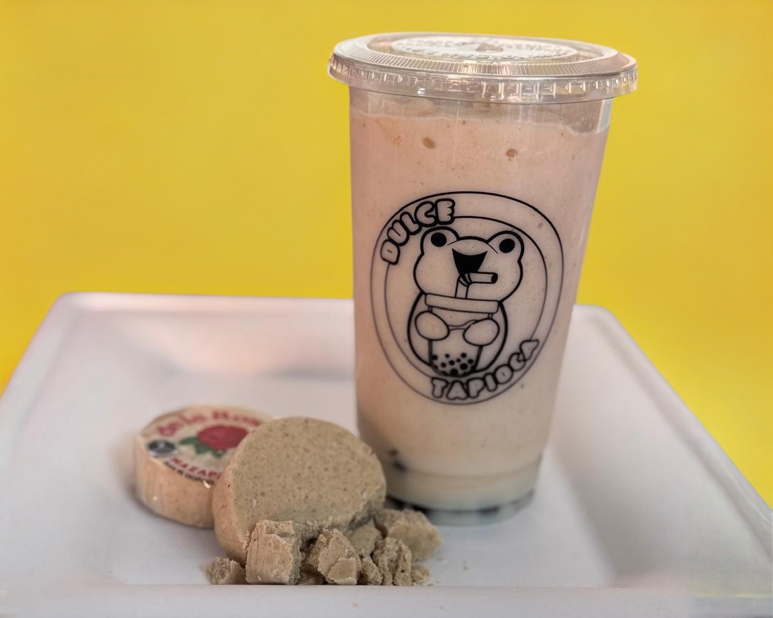 Delicioso frappe base leche sabor mazapán con perlas de tapioca, 22 oz