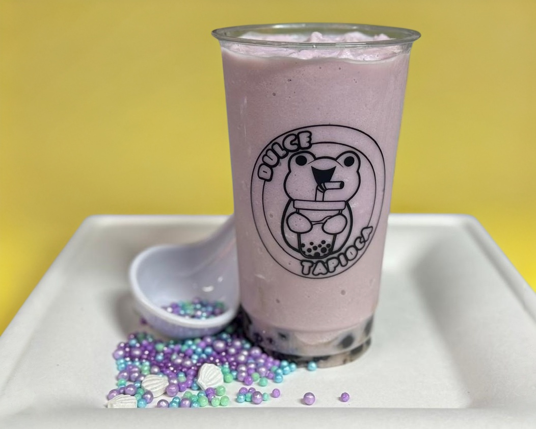 Delicioso frappe base leche sabor taro, raíz dulce tipo camote, con perlas de tapioca 22 oz