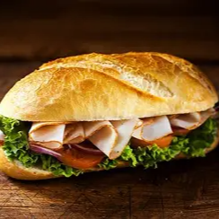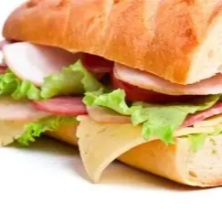 Baguette, Jamon selva negra, queso suizo, manchego, lechuga, jitomate.