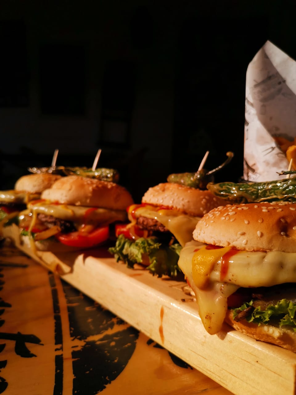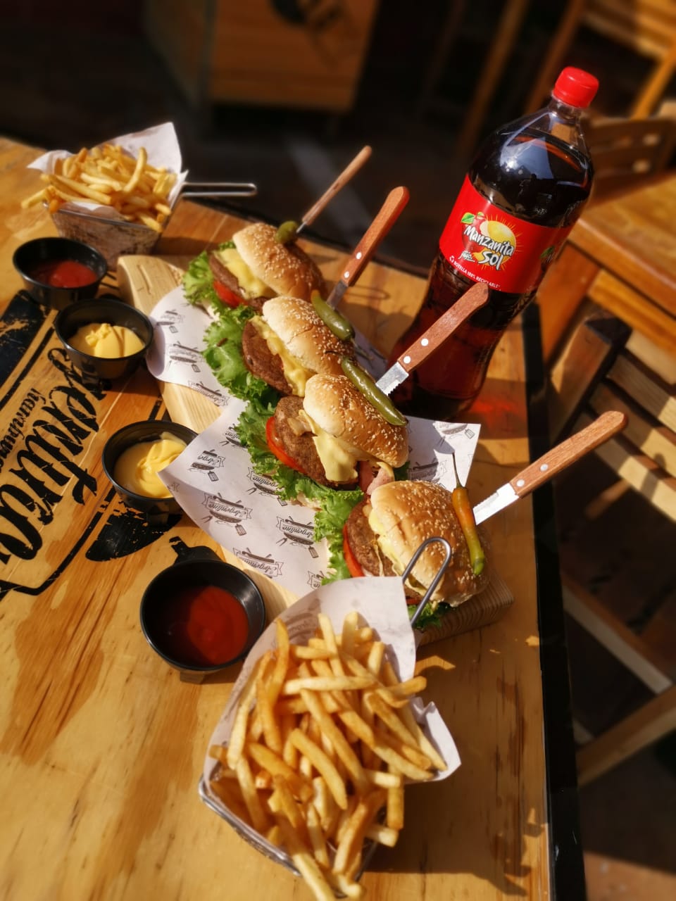 Dos hamburguesas con queso manchego y una orden de papas.