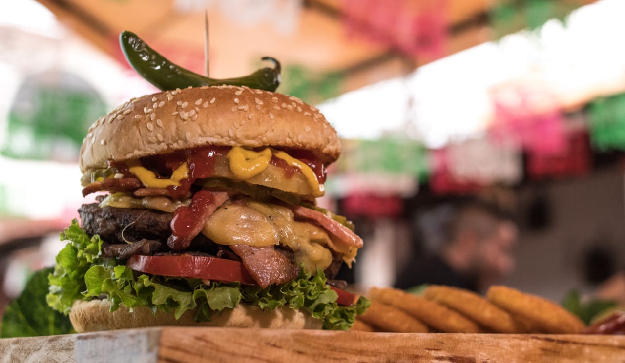 2 Carnes, tocino, queso manchego, piña, mayonesa, mostaza, catsup, lechuga fresca, jitomate, champiñones y cebolla asada.