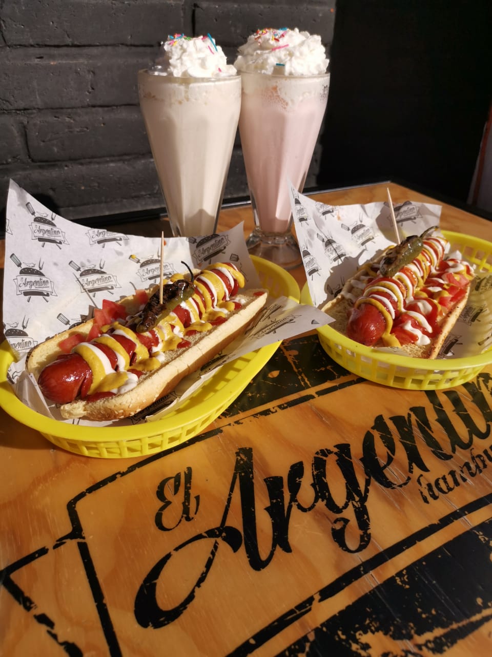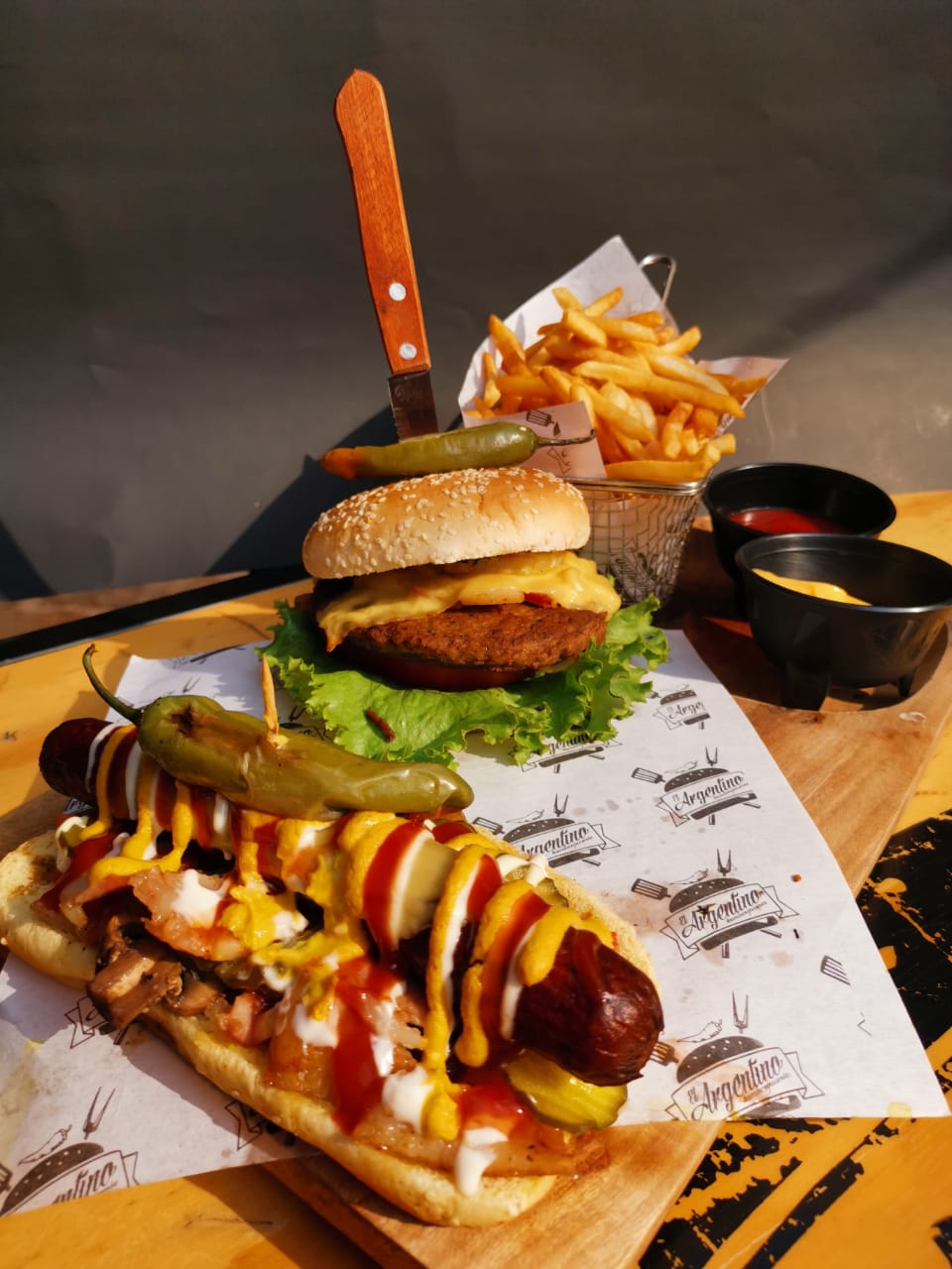 Mayonesa, mostaza, catsup, lechuga fresca, jitomate, champiñones y cebolla asada.El queso que utiliza es manchego. Puedes pedir aderezo de chimichurri.