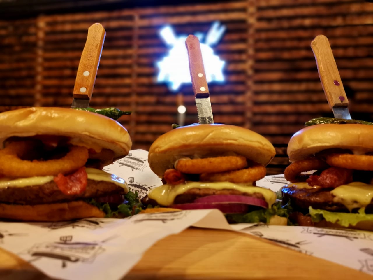 150 gr de carne sirlon manchego tocino rebanado y un aro de cebolla preparada con bollo de BRIOCHE GOURMET mayonesa mostaza catsup chimichurri Lechuga fresca cebolla morada y champiñones asados