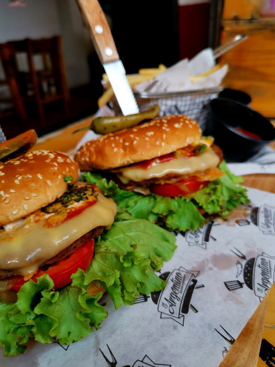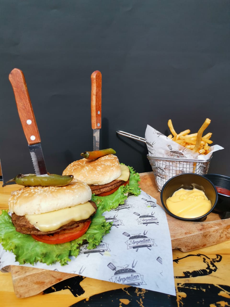 Tocino, Queso y Piña, Mayonesa, mostaza, catsup, lechuga fresca, jitomate, champiñones y cebolla asada.El queso que utiliza es manchego. Puedes pedir aderezo de chimichurri.