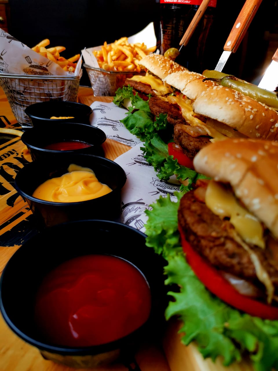 Carne X2 Tocino, queso y piña, Mayonesa, mostaza, catsup, lechuga fresca, jitomate, champiñones y cebolla asada. El queso que utiliza es manchego. Puedes pedir aderezo de chimichurri.