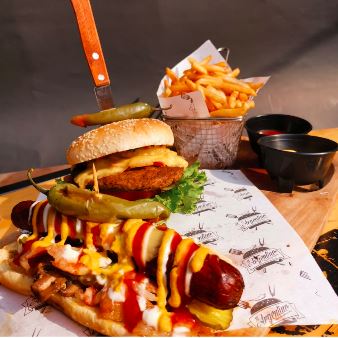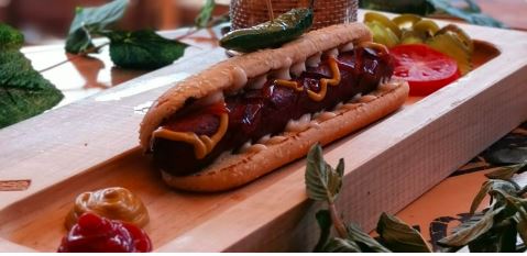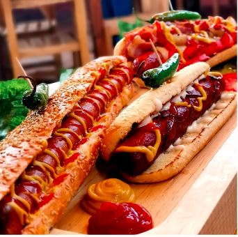 Salchicha de ternera de 40 cm, con tocino dorado, queso fundido, cebolla y jitomate.