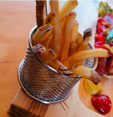 Papas crujientes, queso cheddar fundido y trozos de tocino dorado.