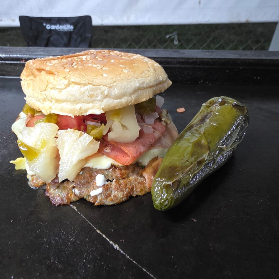 CARNE DE RES, QUESO OAXACA, QUESO MANCHEGO, TOCINO, CEBOLLA, PIÑA, JITOMATE