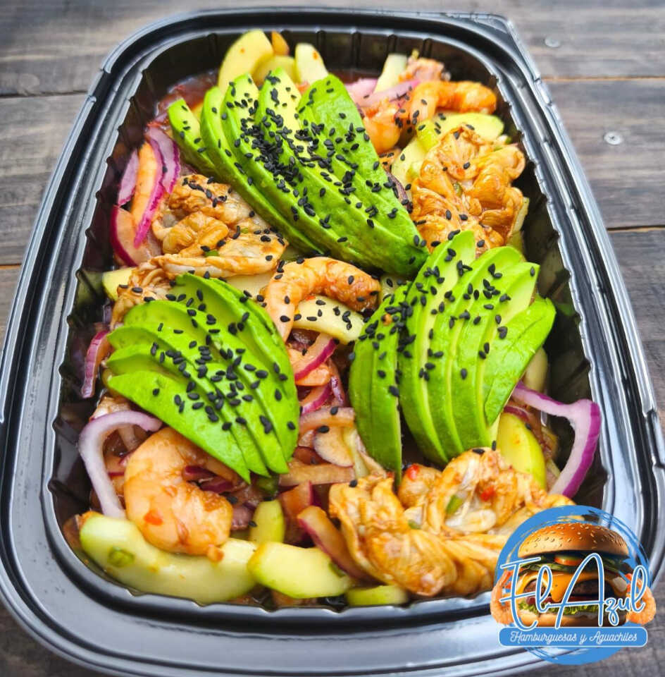 Aguachile con mango, salsas negras, cebolla morada, pepino, aguacate, pimienta, sal, limón, chile chiltepin y chile serrano