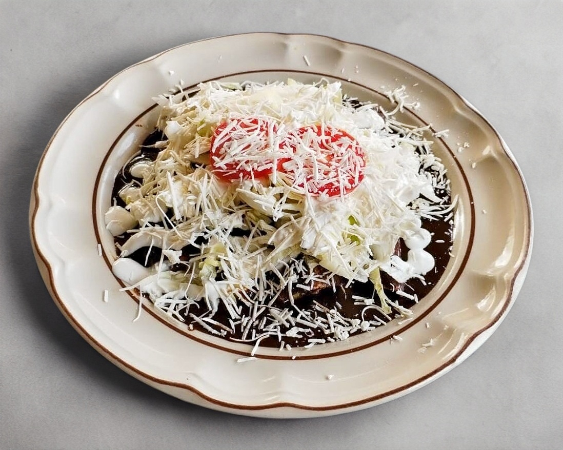 Un manjar tradicional que te encantará. Preparamos cuatro tortillas de maíz hechas a mano y las pasamos por aceite para darles la textura perfecta. Rellenas de pollo deshebrado y cubiertas por completo con nuestro delicioso Mole Rojo de Teloloapan, conocido por su toque sutilmente dulce y especiado. Terminadas con crema, queso rallado, lechuga crujiente y rodajas de jitomate fresco.