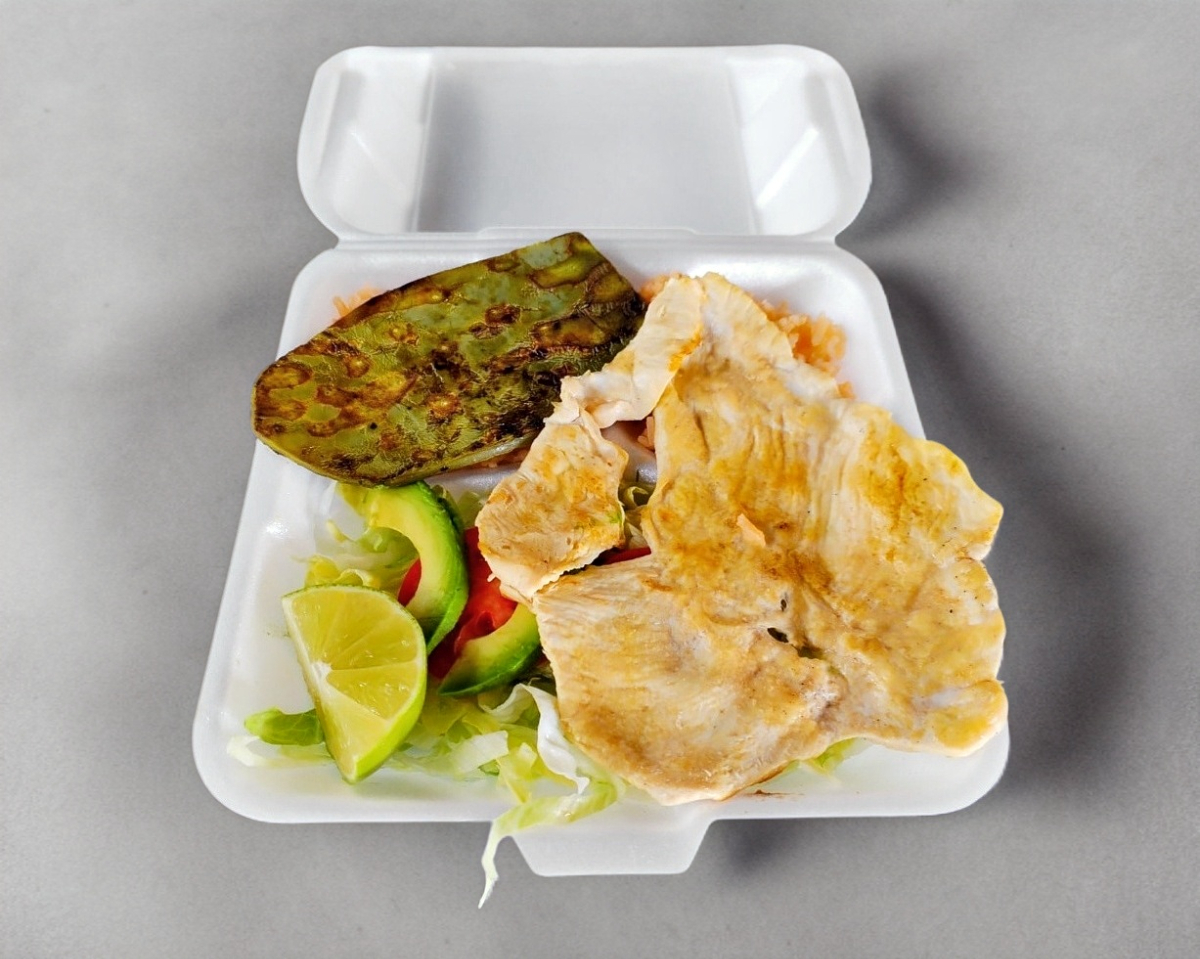 Jugoso filete de pechuga de pollo asado al comal, acompañado de un nopal de penca asado y sazonado. Incluye guarnición tradicional de arroz y frijoles de la olla. Servido con ensalada fresca de lechuga, jitomate y láminas de aguacate, más 3 tortillas de maíz hechas a mano.