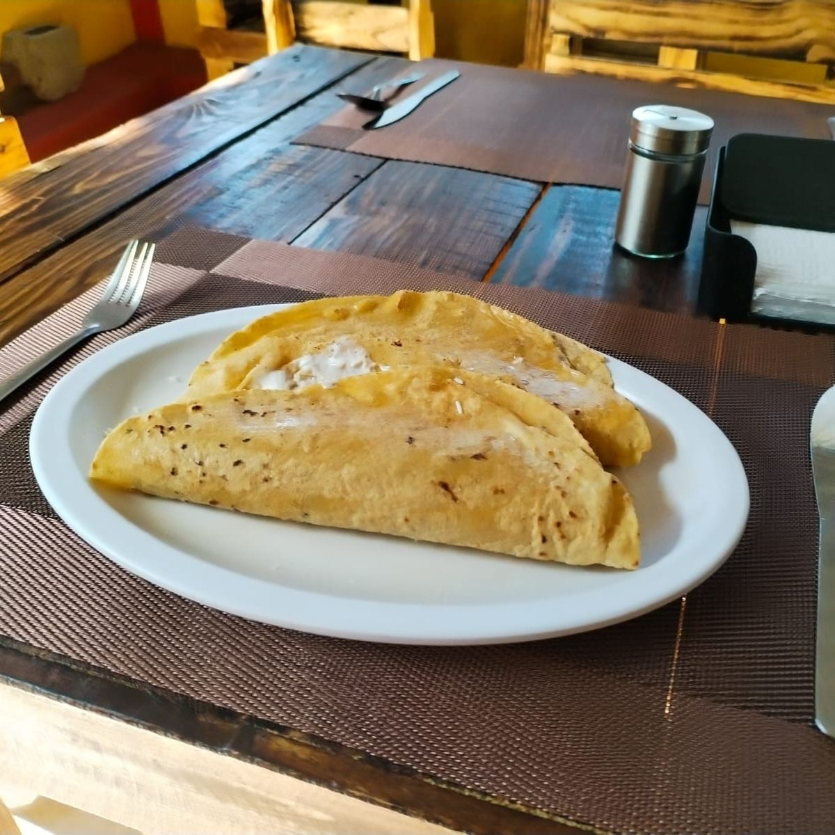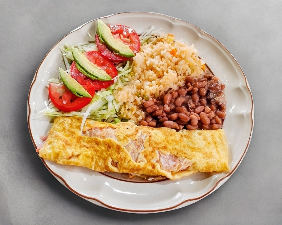 Un esponjoso omelette de huevo fresco, relleno con láminas de jamón de pavo y el exquisito y suave sabor del queso Oaxaca fundido. Servido sobre una ligera y refrescante cama de ensalada (lechuga, jitomate y láminas de aguacate). Acompañamos con una porción de arroz rojo al estilo casero, frijoles de la olla calientitos y tres tortillas de maíz hechas a mano.