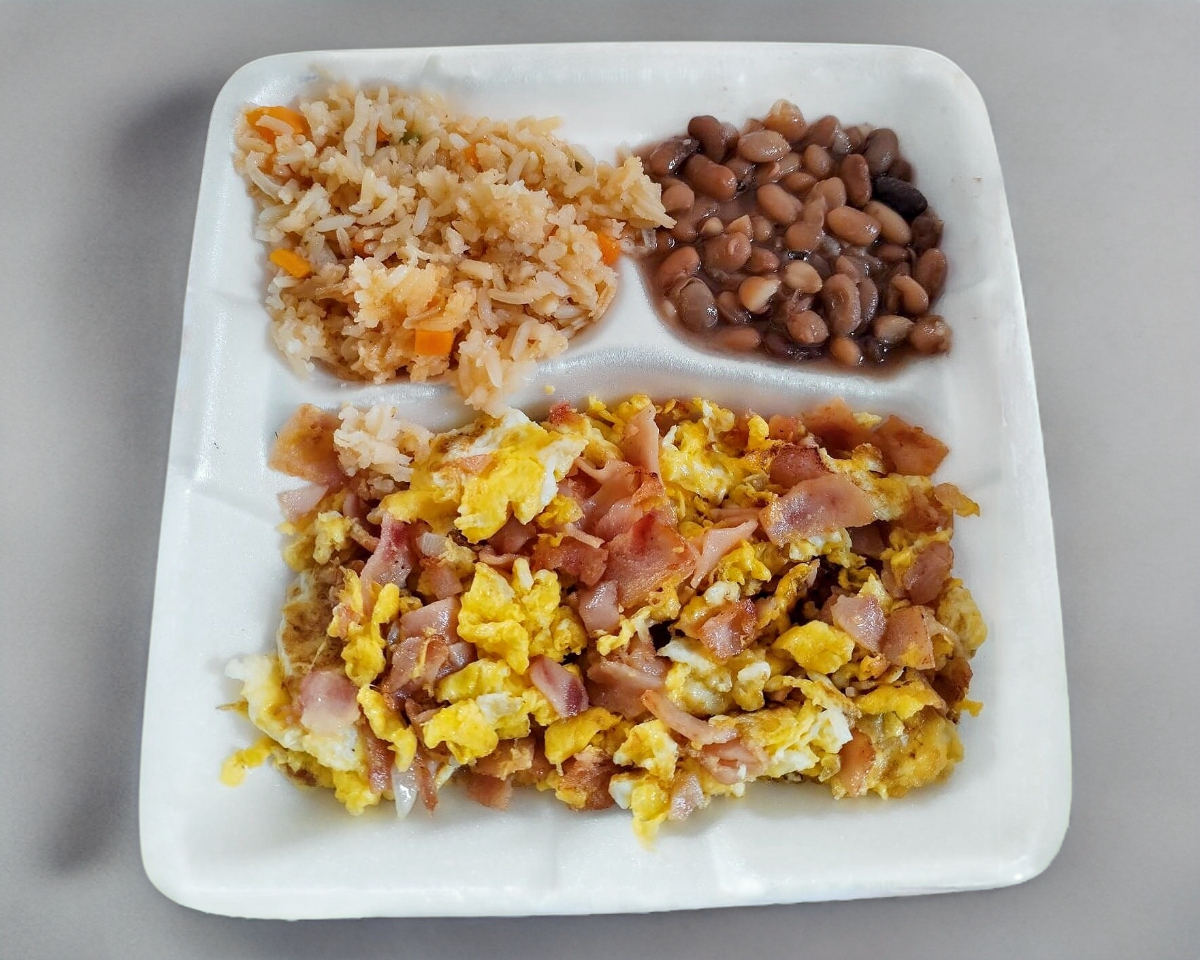El clásico de clásicos: huevos revueltos esponjosos mezclados con trozos de jamón de pavo, sazonados a la perfección. Acompañados de arroz y frijoles de la olla calientitos. Incluye 3 tortillas de maíz hechas a mano.