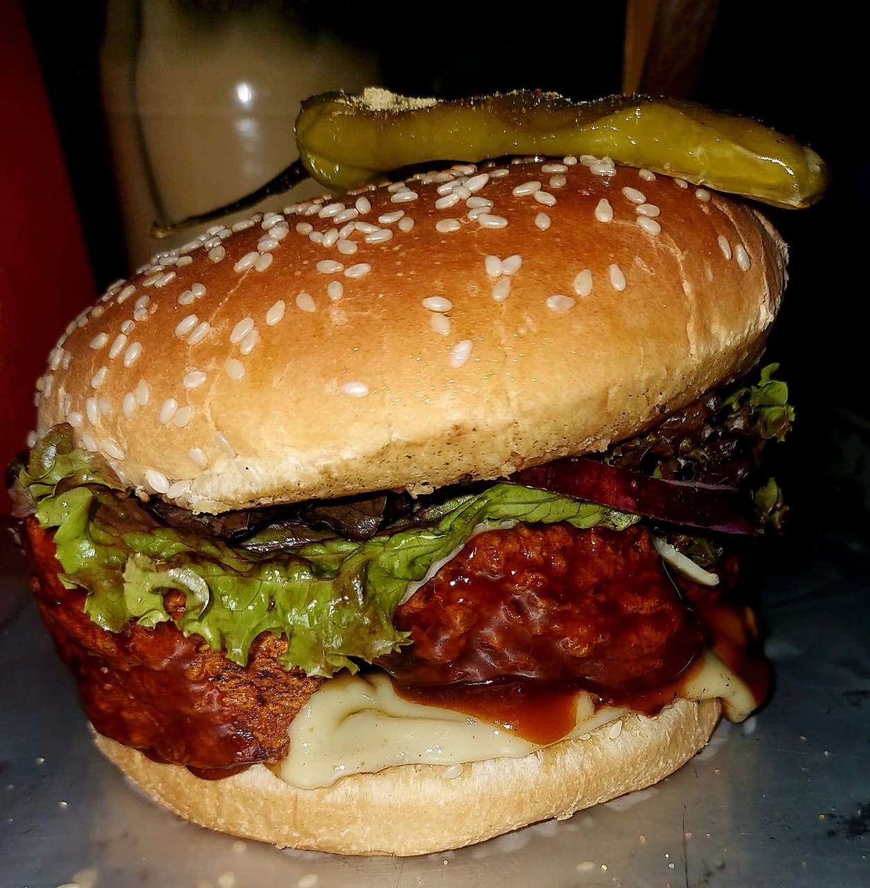 Doble carne, doble queso, jamón, tocino, salchicha, cebolla caramelizada y aderezo BBQ.