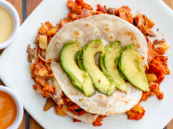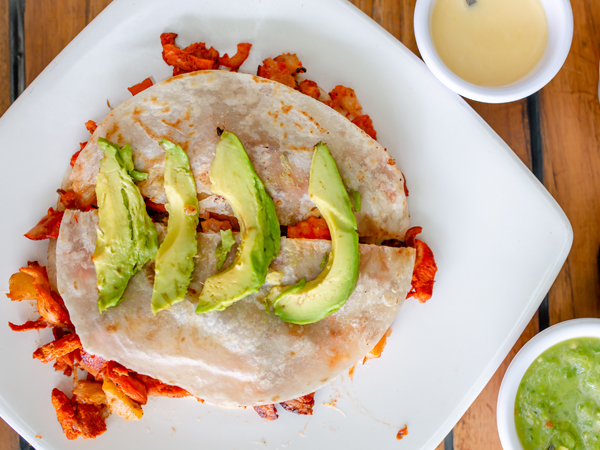 3 tortillas de harina con delicioso bistec, piña, jamón, aguacate y doble porción de queso gratinado. ¡una delicia!