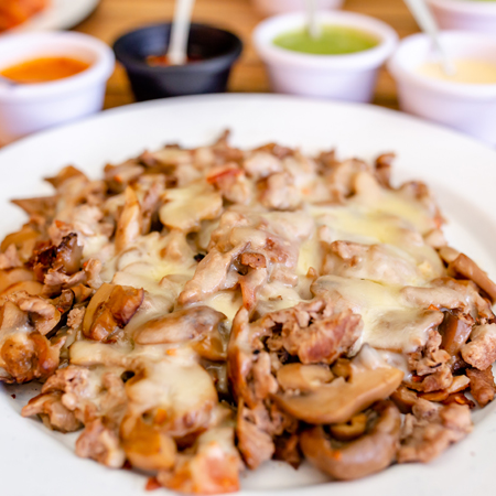 Jugoso bistec de primera calidad, carne al pastor, tocino y queso gratinado.