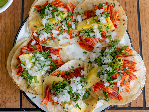 Carne al pastor, jamon, piña, aguacate y queso gouda gratinado servida en tres tortillas de harina