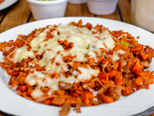 Deliciosa carne al pastor con queso gouda gratinado, servido en dos tortillas de harina.