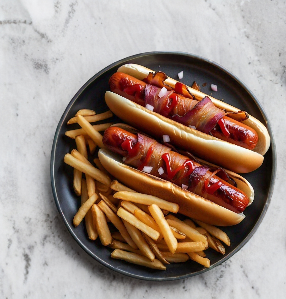 2 hotdogs envueltos en tocino, cebolla asada, bbq y mayonesa, ambos acompañados con papas francesas. (Mejor que los de carrito).