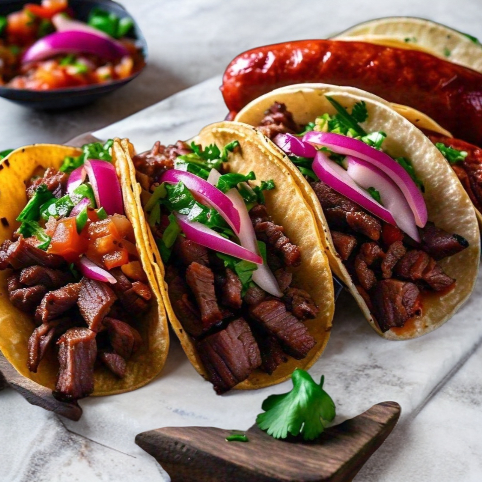 Delicioso TACO de (65gr) ARRACHERA + PICAÑA + CHORIZO ARGENTINO + CHISTORRA en tortilla de maíz o harina. Incluye encima cebolla asada y papas francesas