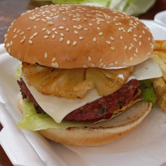 100g de Carne, Piña, Queso suizo, Lechuga, Jitomate, Cebolla, Mayonesa, Cátsup, Mostaza y Chile.