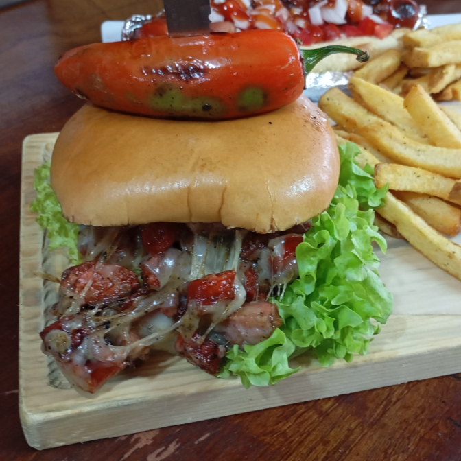 100g de Carne de Res, Chistorra, Queso Monterrey, Lechuga, Jitomate, Cebolla, Mayonesa, Cátsup, Mostaza y Chile.