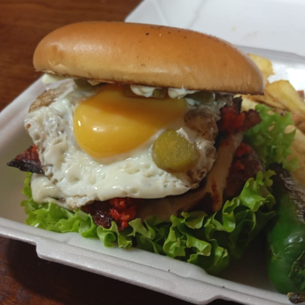 100g de Carne, Longaniza Asada, Tocino, Huevo Estrellado, Lechuga, Jitomate, Cebolla, Mayonesa, Cátsup, Mostaza y Chile.