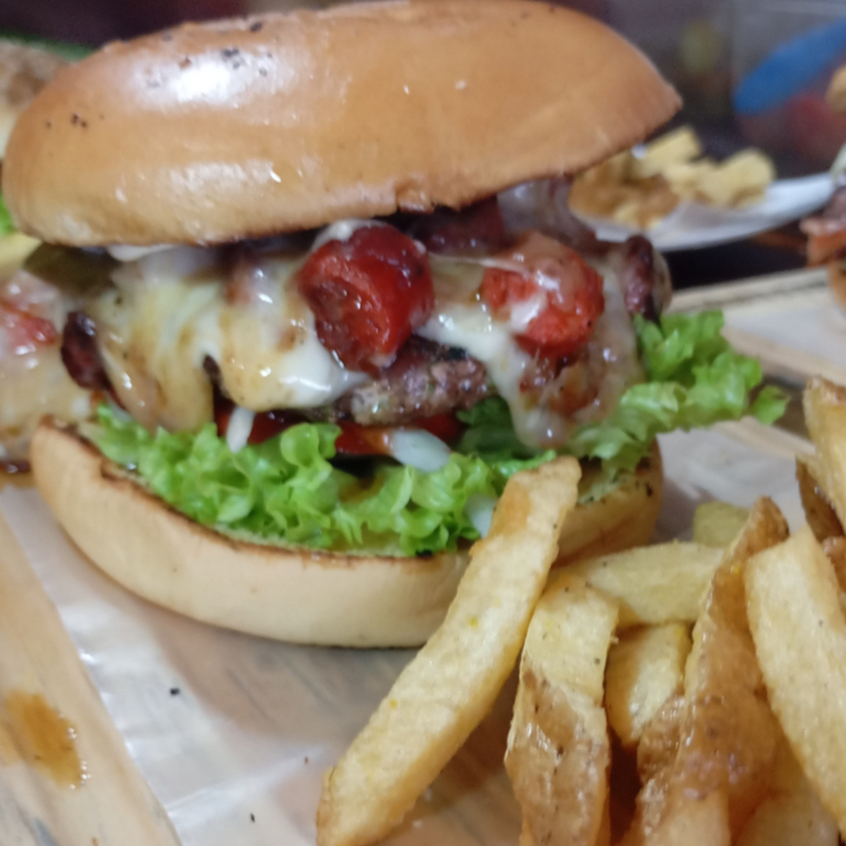 100g de Carne, Tocino, Queso suizo, Lechuga, Jitomate, Cebolla, Mayonesa, Cátsup, Mostaza y Chile.