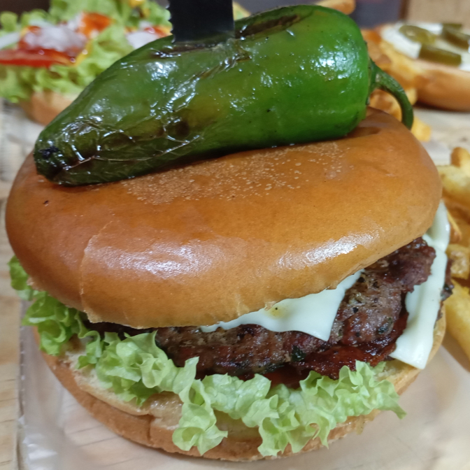 Una de Carne de 200g, Queso suizo, Lechuga, Jitomate, Cebolla, Mayonesa, Cátsup, Mostaza y Chile.
