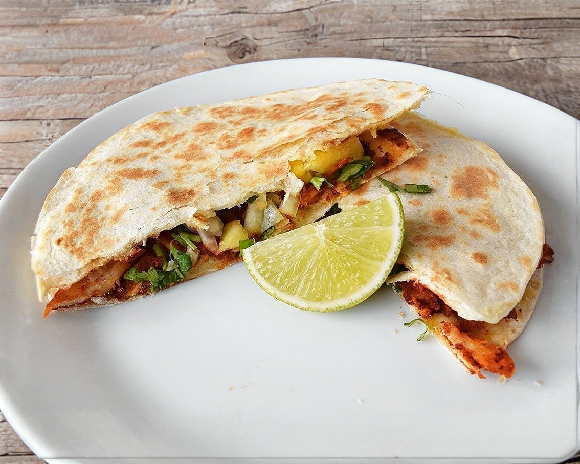 1 Tortilla de harina, carne de pastor y queso oaxaca.