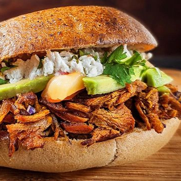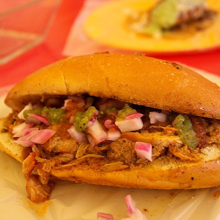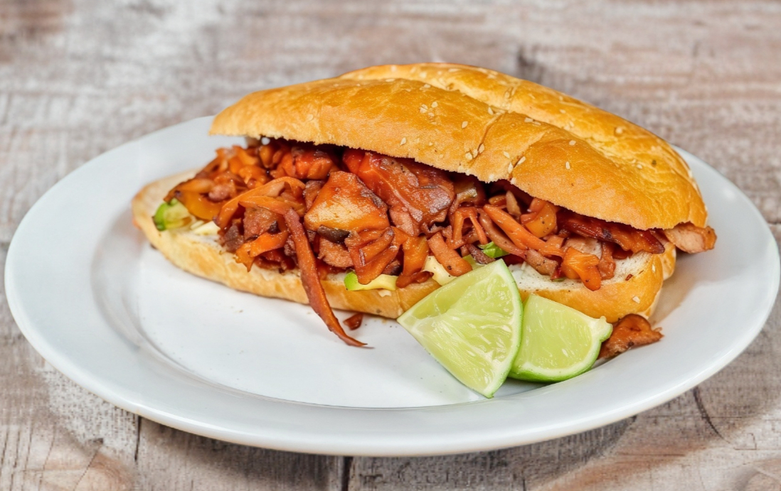 Delicioso bolillo crugiente, relleno de cochinita pibil y costra de queso manchego