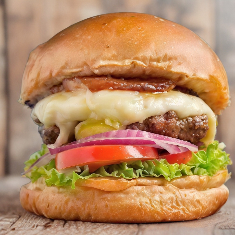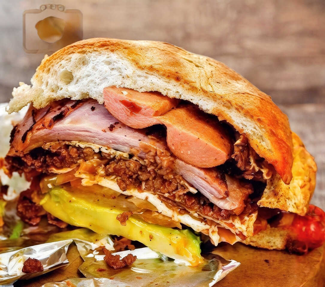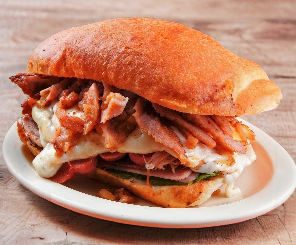 Carne de res 100 g, jamón, tocino, queso manchego, jitomate, cebolla y lechuga.