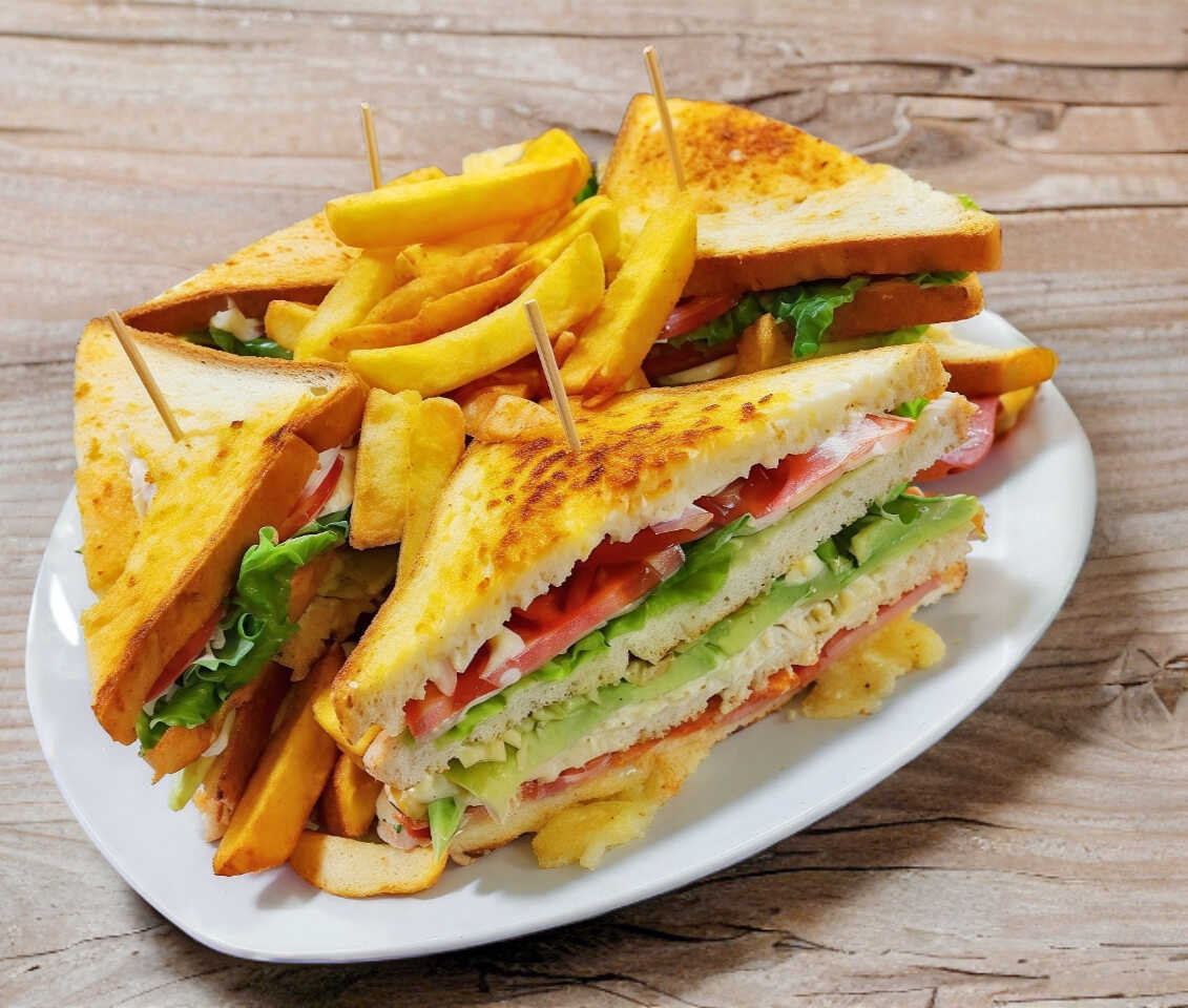 Tres piezas de pan blanco, milanesa de pollo, aguacate, lechuga, cebolla y tocino.