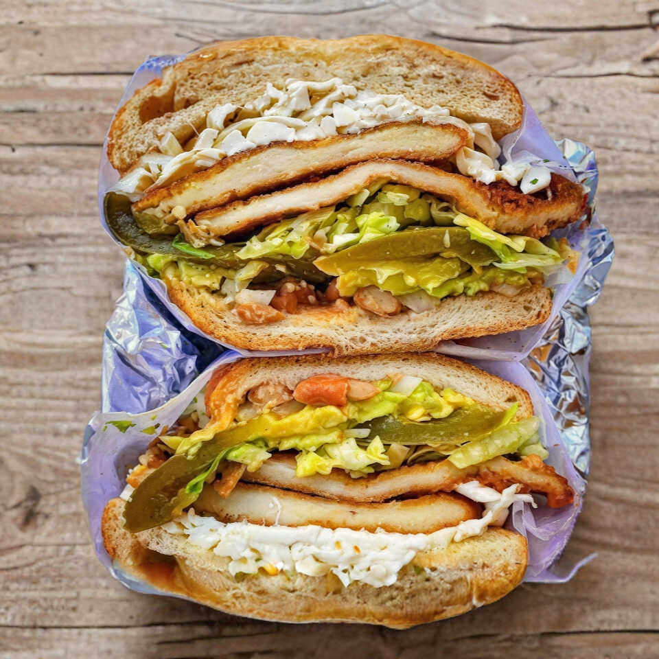 Torta de milanesa de pollo, jamón, queso, frijoles, cebolla, jitomate, aguacate y lechuga.