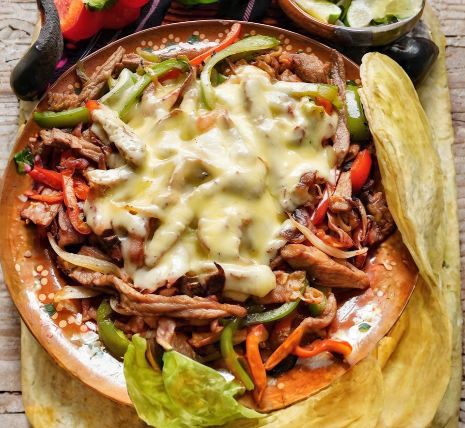CARNE AL PASTOR CON DELICOSO QUESO ACOMPAÑADO DE CEBOLLA CARAMELIZADA Y CILANTRO