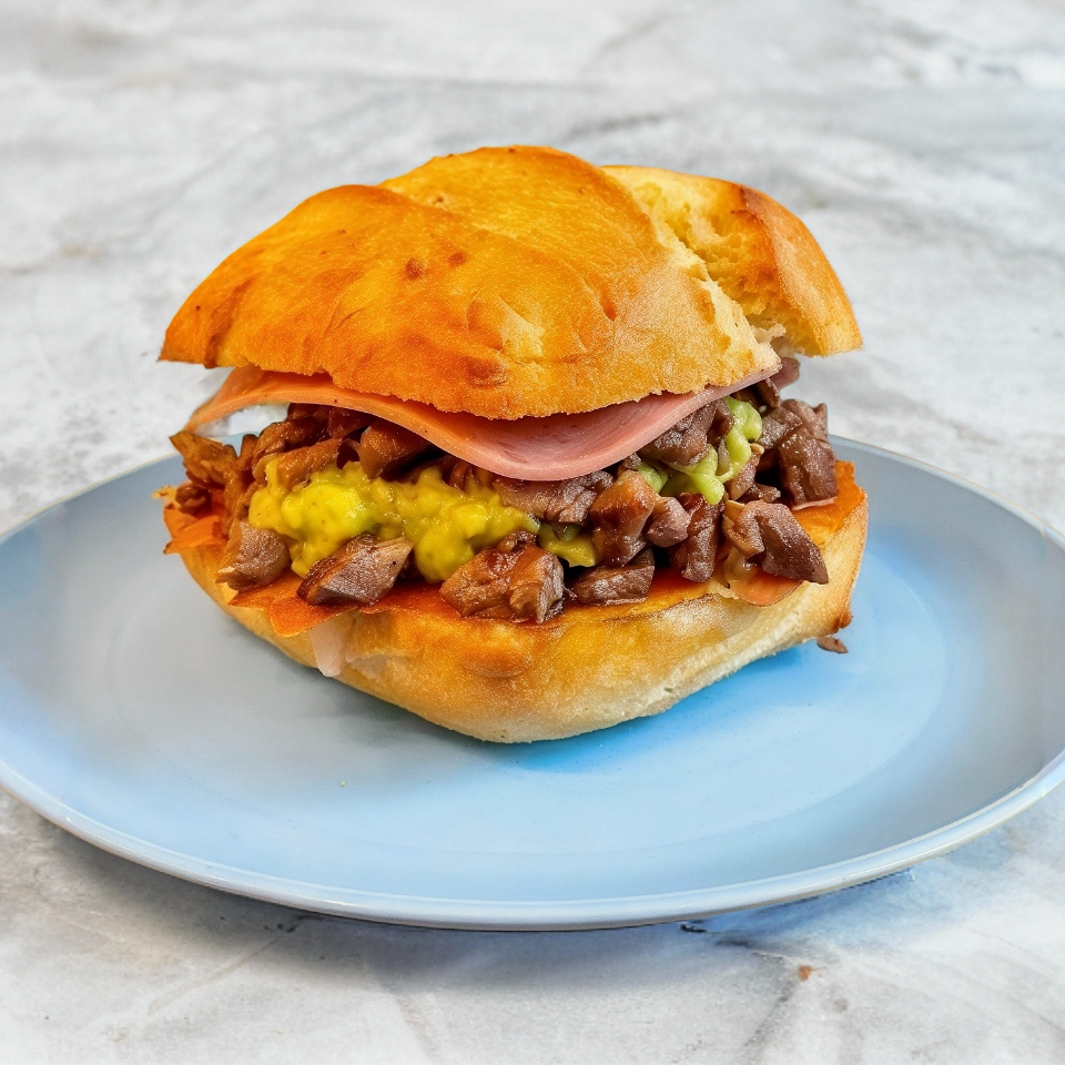 Torta de Pastor, bistec, salchicha, jamón, española, queso, frijoles, cebolla, jitomate, aguacate y lechuga.