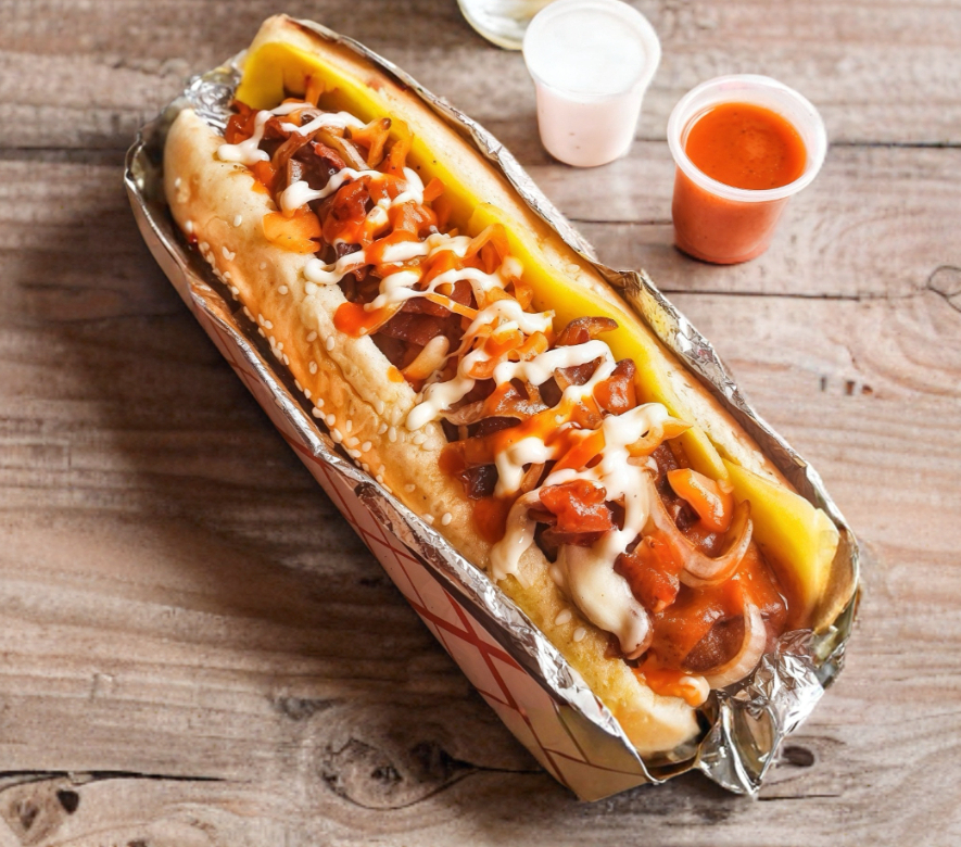 Pan jumbo, salchicha jumbo, bistec, queso y cebolla.