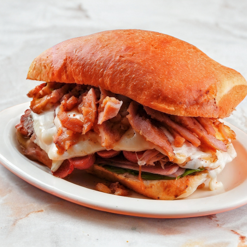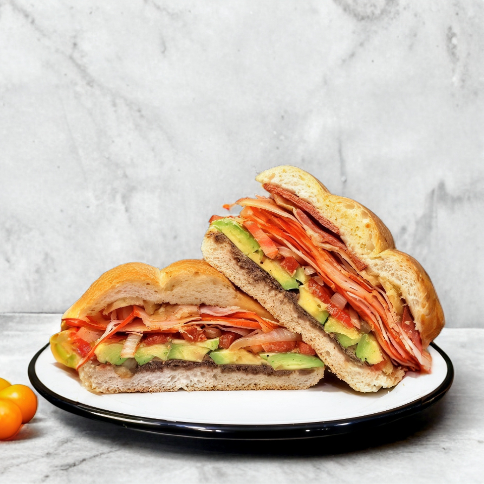 Torta de Milanesa de pollo, salchicha, jamón, española, queso, frijoles, cebolla, jitomate, aguacate y lechuga.