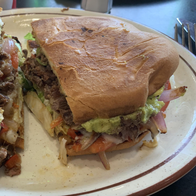 Torta de delicioso bistec jugoso, queso manchego, frijoles, lechuga, cebolla, aguacate y jitomate.