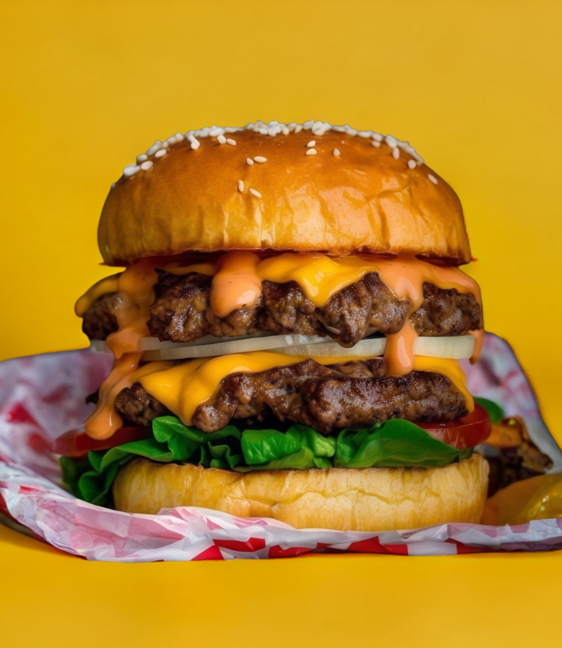 Doble carne de hamburguesa, jamón, tocino, queso manchego, jitomate, cebolla y lechuga.