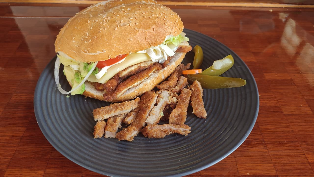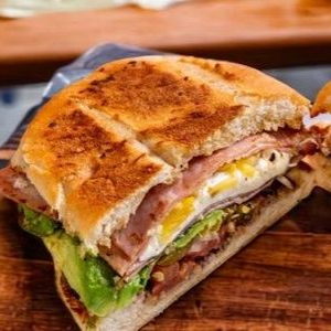 Porcion personal: Pan blanco con milanesa de pollo, aguacate, lechuga, cebolla, tocino y queso.