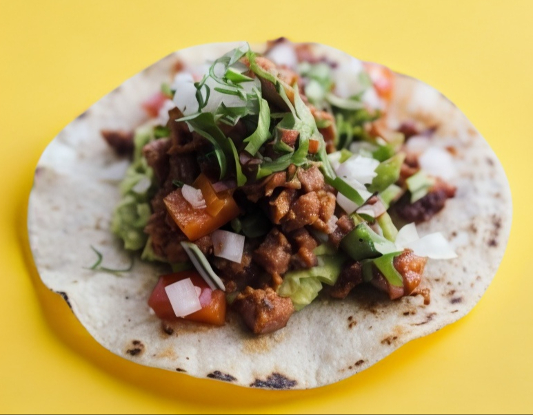 Tortilla de harina jumbo, carne al pastor, frijoles, aguacate, cebolla y lechuga.